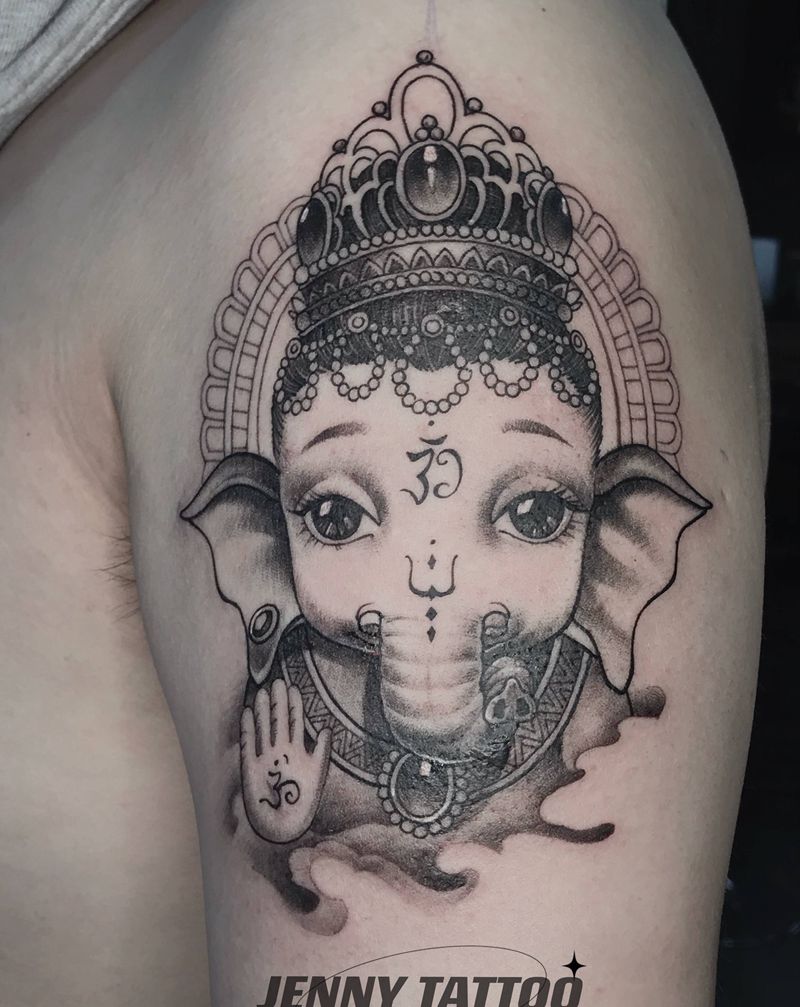 当前位置: 首页 >辽宁省大连市纹身店-玄铭堂纹身纹身图案>小象神纹身图片_肩部手臂新传统神象神纹身图案