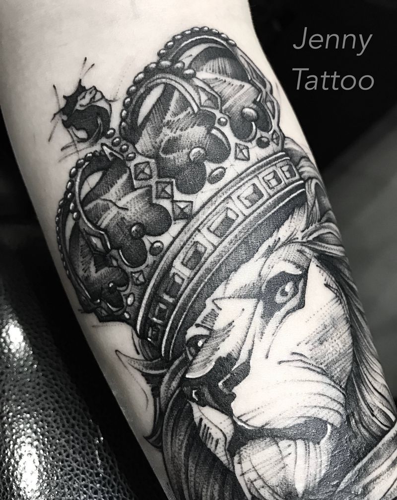 狮子遮盖纹身图片_手臂点刺狮子皇冠素描纹身图案