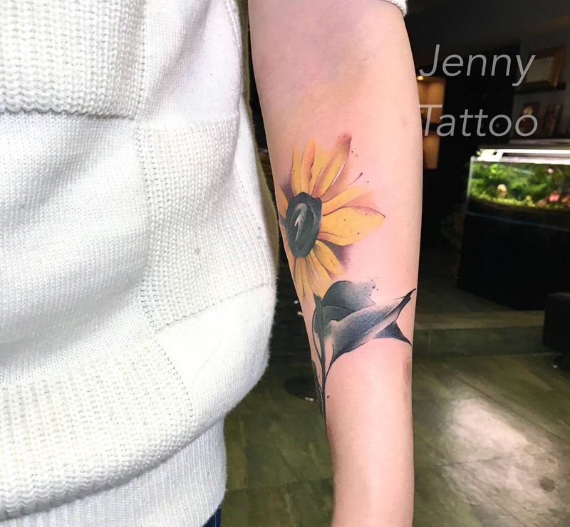 当前位置: 首页 >辽宁省大连市纹身店-玄铭堂纹身纹身图案>水墨向日葵纹身图片_手臂水墨水彩植物向日葵设计纹身图案