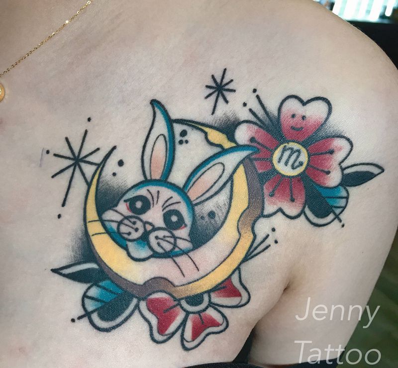 天蝎兔子纹身图片_肩部Old School星座兔子月亮纹身图案