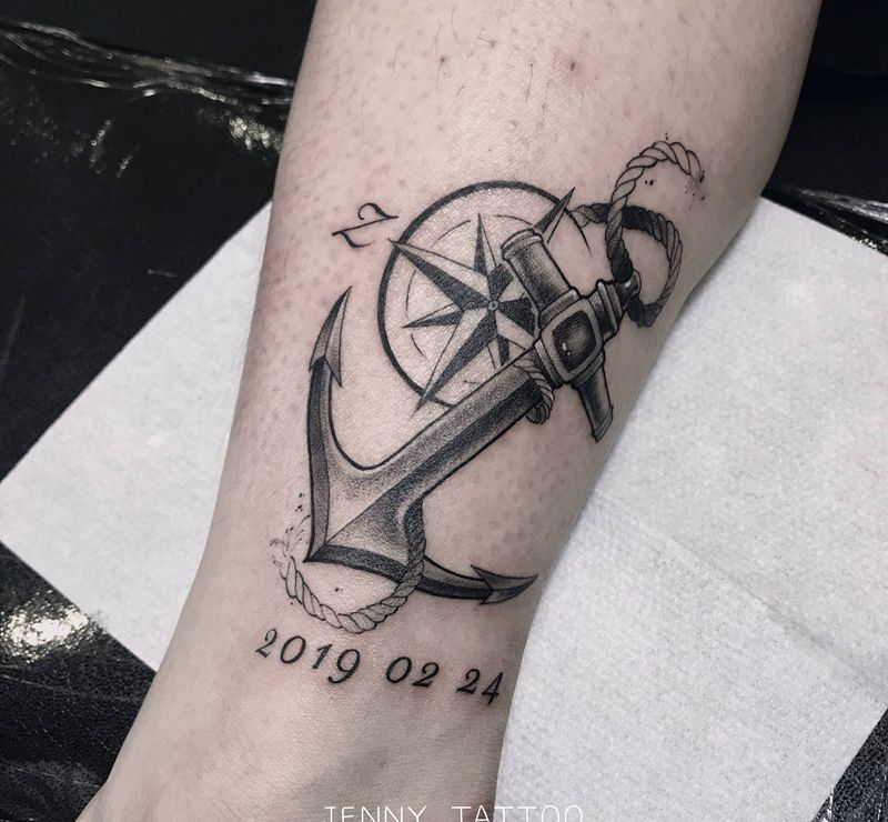 原创情侣纹身纹身图片_脚部腿部欧美写实原创指南针船锚纹身图案