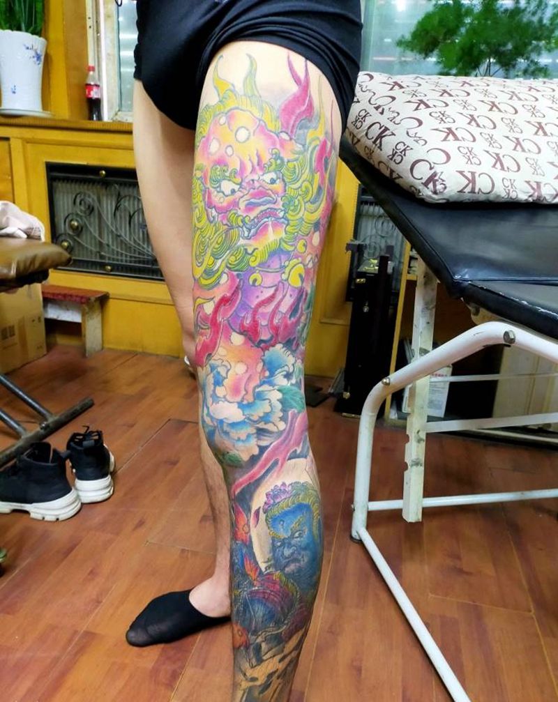 • T网红王老大花腿龙纹身图片_腿部新传统纹身图案