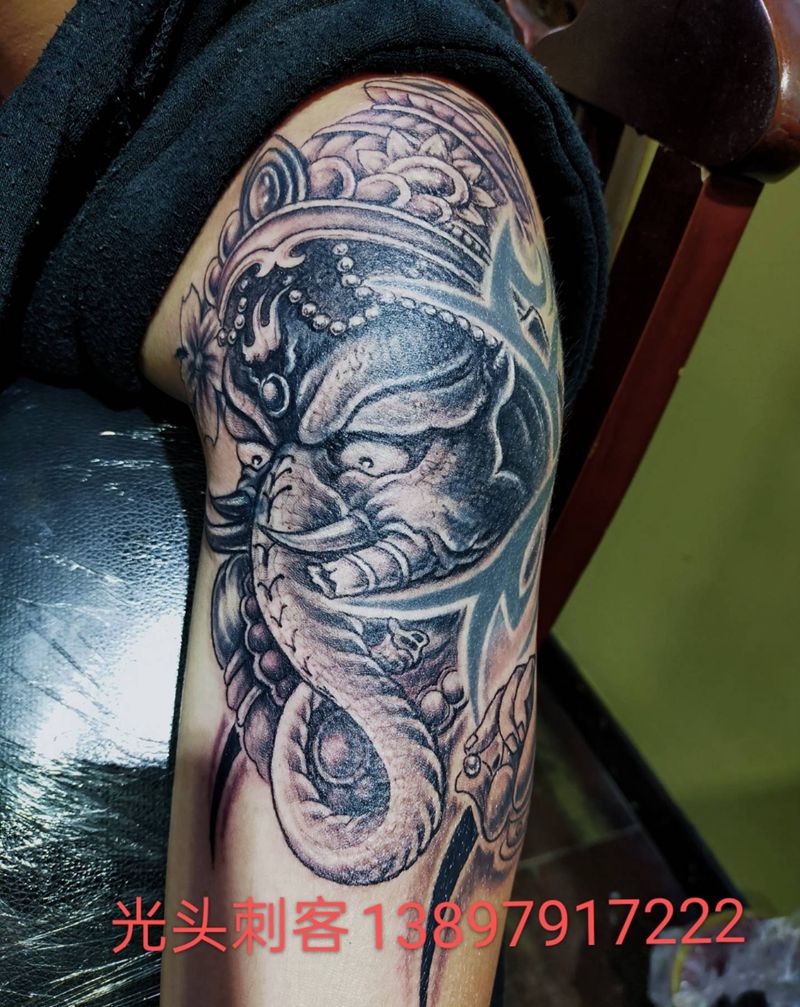 当前位置: 首页 >辽宁省沈阳市纹身店-新民光头刺客纹身艺术馆纹身图案>本店作品纹身图片_颈部手臂新传统老传统纹身图案