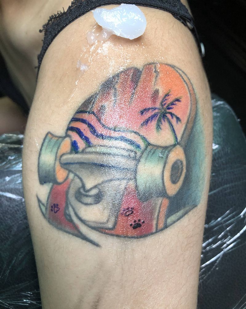 当前位置: 首页 >辽宁省大连市纹身店-方脸哪吒刺青纹身图案>旧物改造纹身图片_手臂Old School滑板风景纹身图案