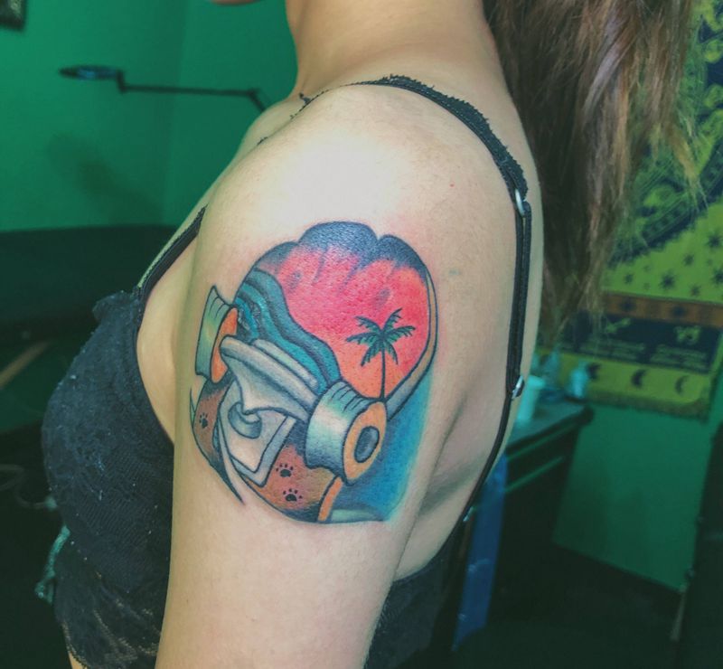 当前位置: 首页 >辽宁省大连市纹身店-方脸哪吒刺青纹身图案>旧物改造纹身图片_手臂Old School滑板风景纹身图案
