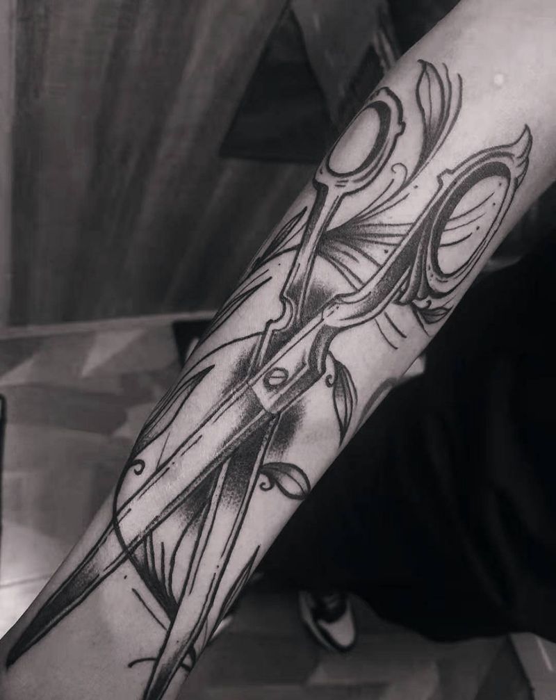 小臂外侧剪刀纹身图片_手臂New School几何剪刀纹身图案