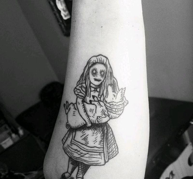 当前位置: 首页 >辽宁省大连市纹身店-方脸哪吒刺青纹身图案>抱猪女孩纹身图片_手臂暗黑纹身图案