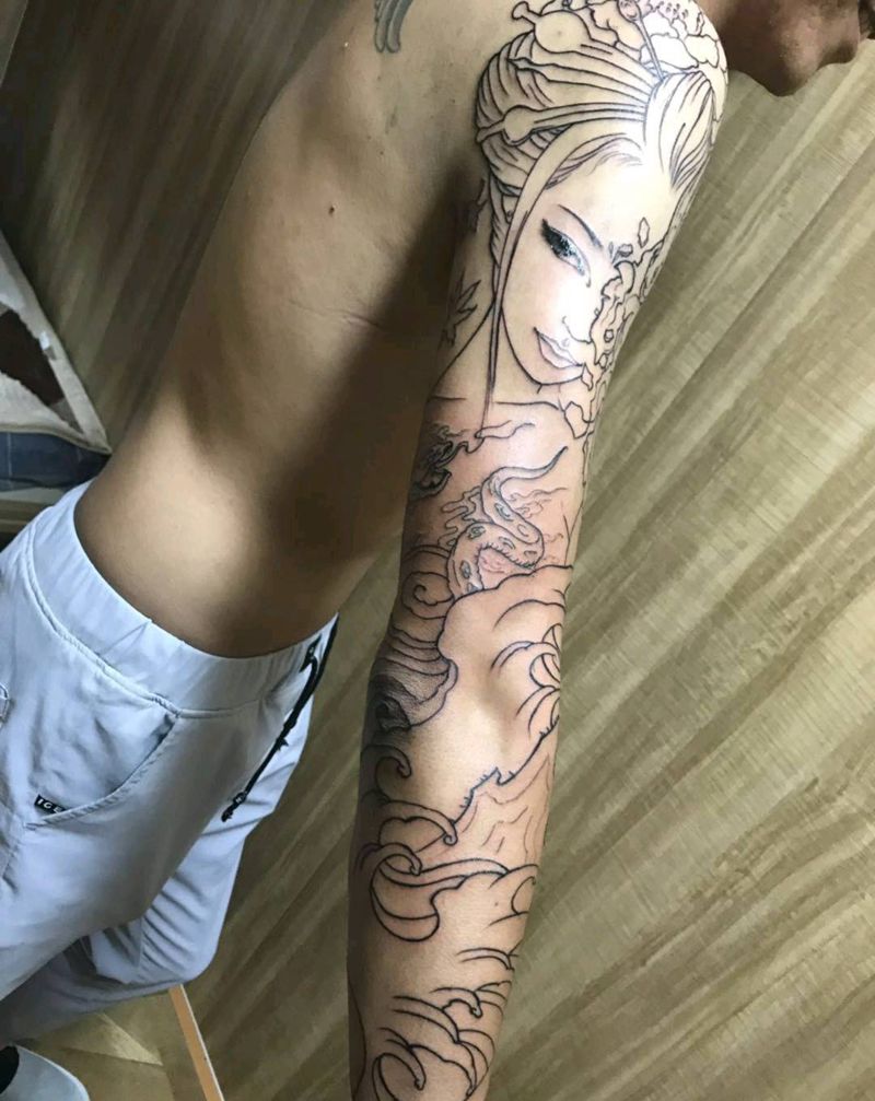 艺伎花臂纹身图片_手臂新传统艺伎海浪纹身图案