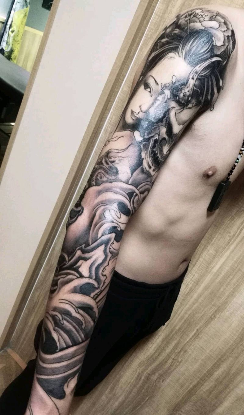 艺伎花臂纹身图片_手臂新传统艺伎海浪纹身图案