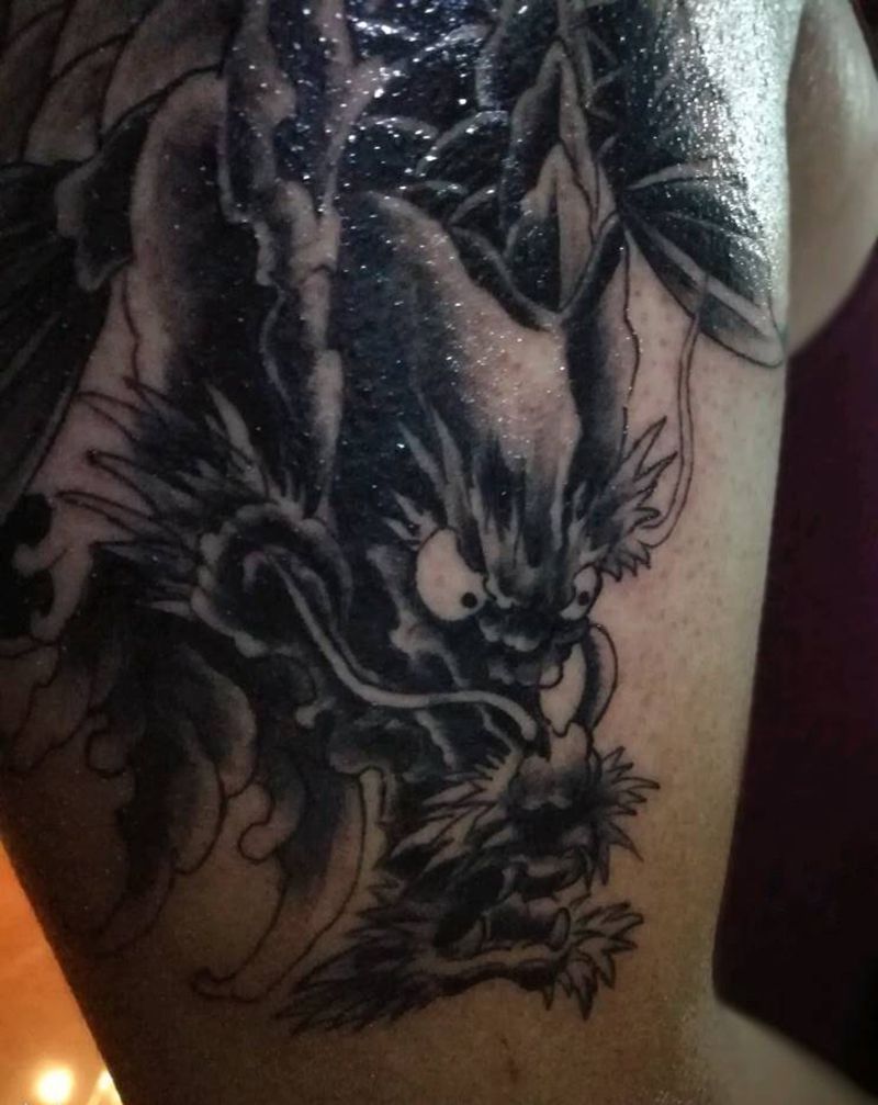 • T网红王老大花腿龙纹身图片_腿部新传统纹身图案