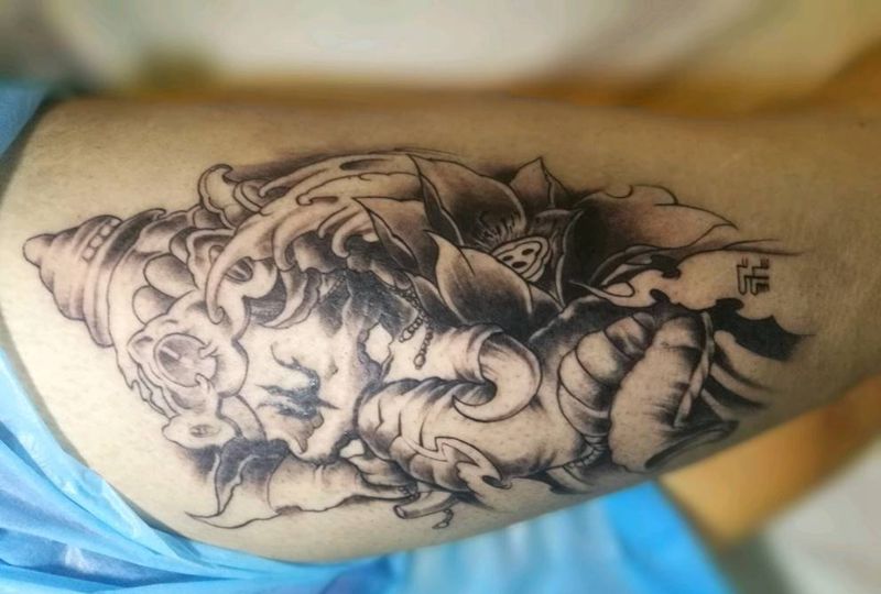 黑白象神纹身图片_腿部传统鬼神成品纹身图案