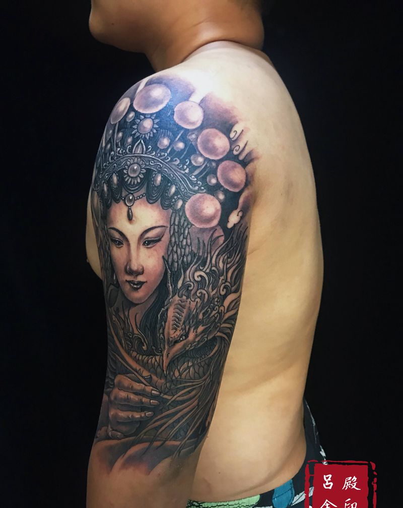 当前位置: 首页 >辽宁省大连市纹身店-金势刺青TATTOO纹身图案>花旦纹身图片_手臂肩部新传统纹身图案