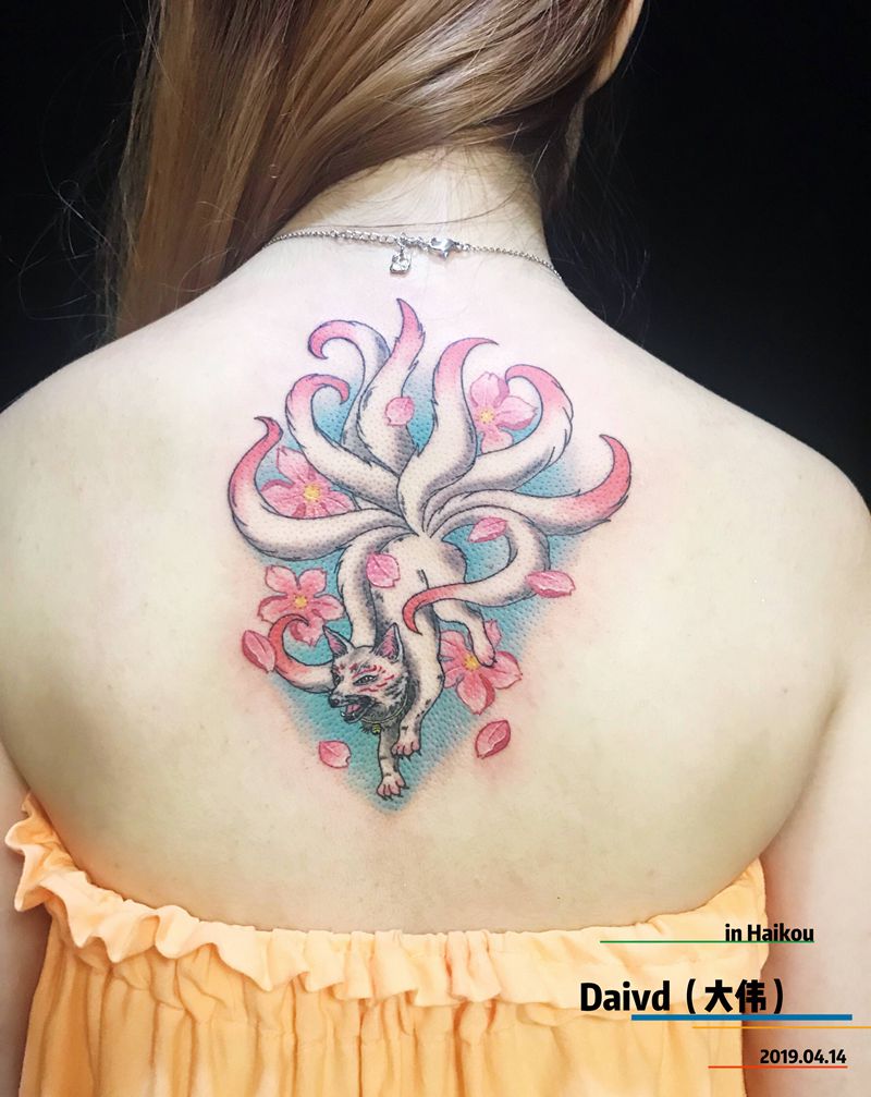 九尾狐纹身图片_背部水彩New School纹身图案