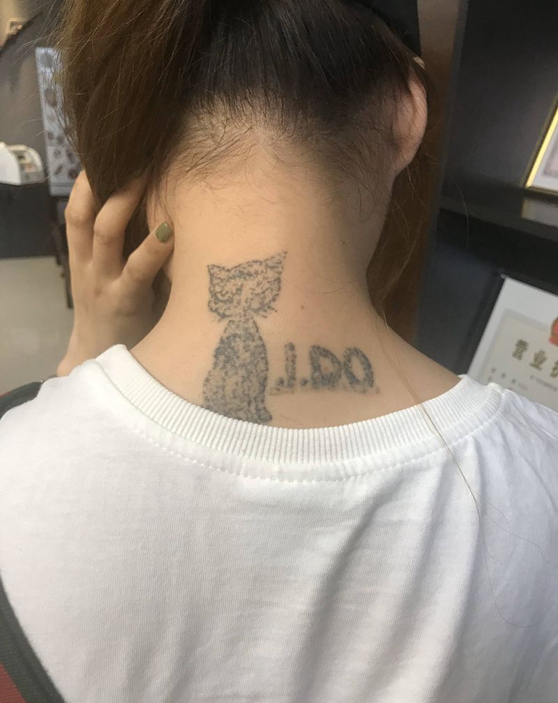 水彩猫遮盖纹身图片_颈部水彩纹身图案
