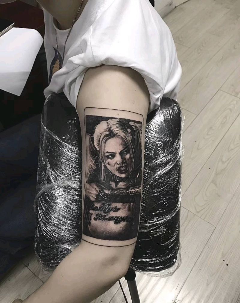 当前位置: 首页 >辽宁省大连市纹身店-时间刺客纹身图案>写实小丑女纹身图片_手臂欧美写实纹身图案