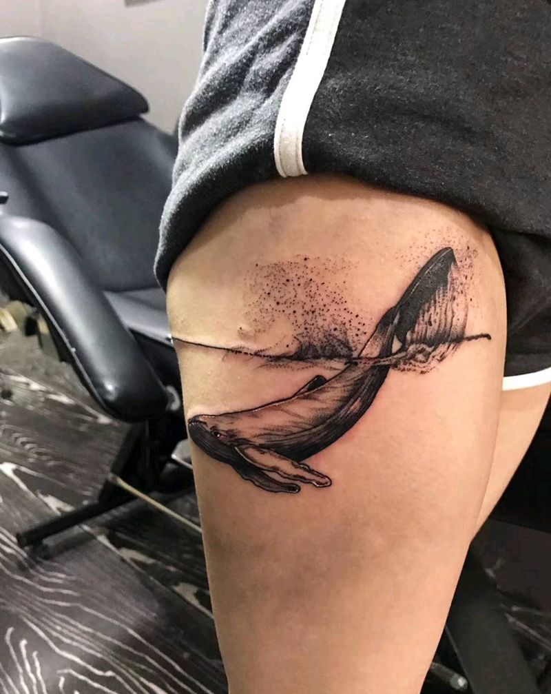 黑灰写实鲸鱼纹身图片_腿部欧美写实纹身图案