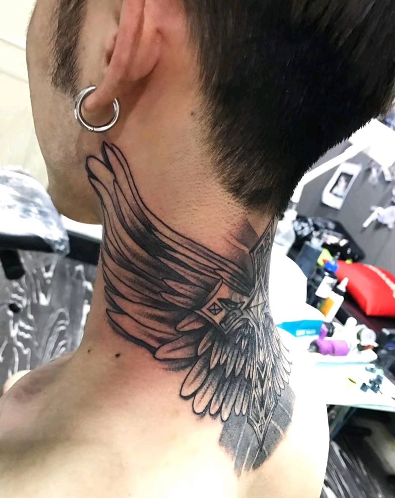 颈部翅膀遮盖纹身图片_颈部欧美写实纹身图案