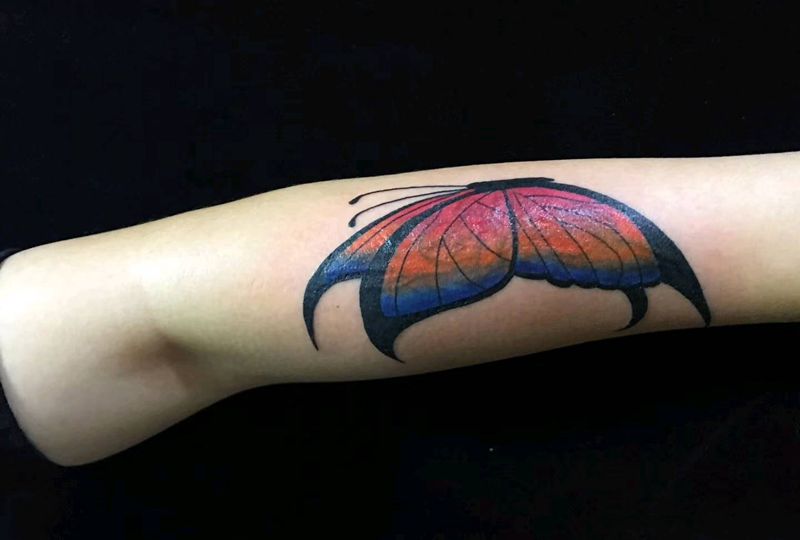当前位置: 首页 >辽宁省大连市纹身店-时间刺客纹身图案>蝴蝶旧图遮盖纹身图片_手臂New School纹身图案