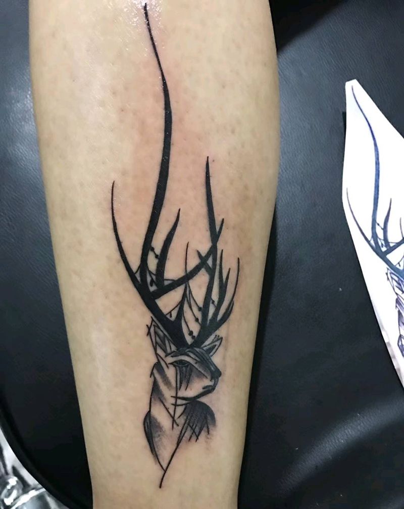 鹿头纹身图片_腿部点刺纹身图案