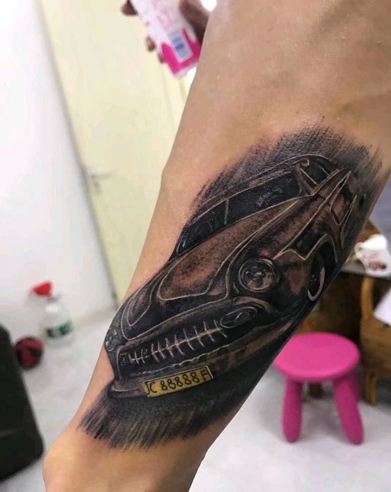 当前位置: 首页 >辽宁省大连市纹身店-时间刺客纹身图案>黑灰写实老爷车纹身图片_手臂欧美写实纹身图案