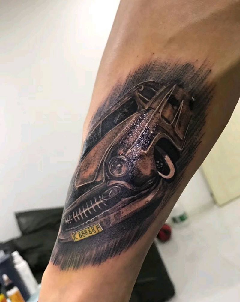 当前位置: 首页 >辽宁省大连市纹身店-时间刺客纹身图案>黑灰写实老爷车纹身图片_手臂欧美写实纹身图案