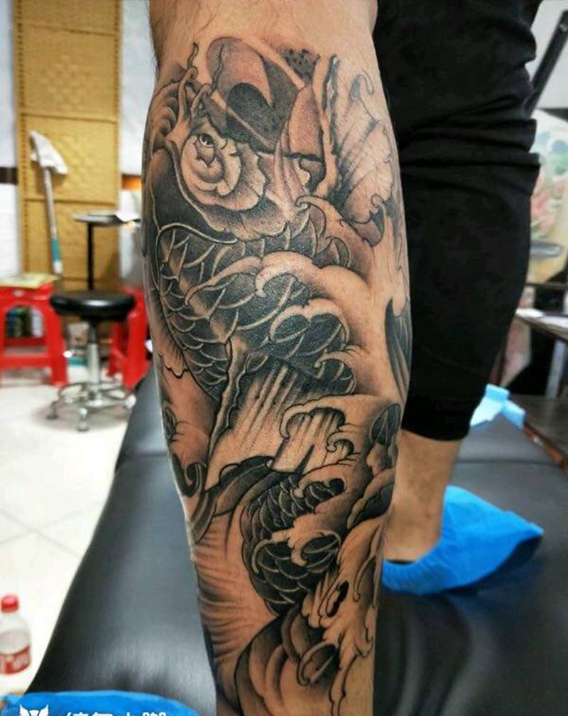 • T网红王老大花腿龙纹身图片_腿部新传统纹身图案