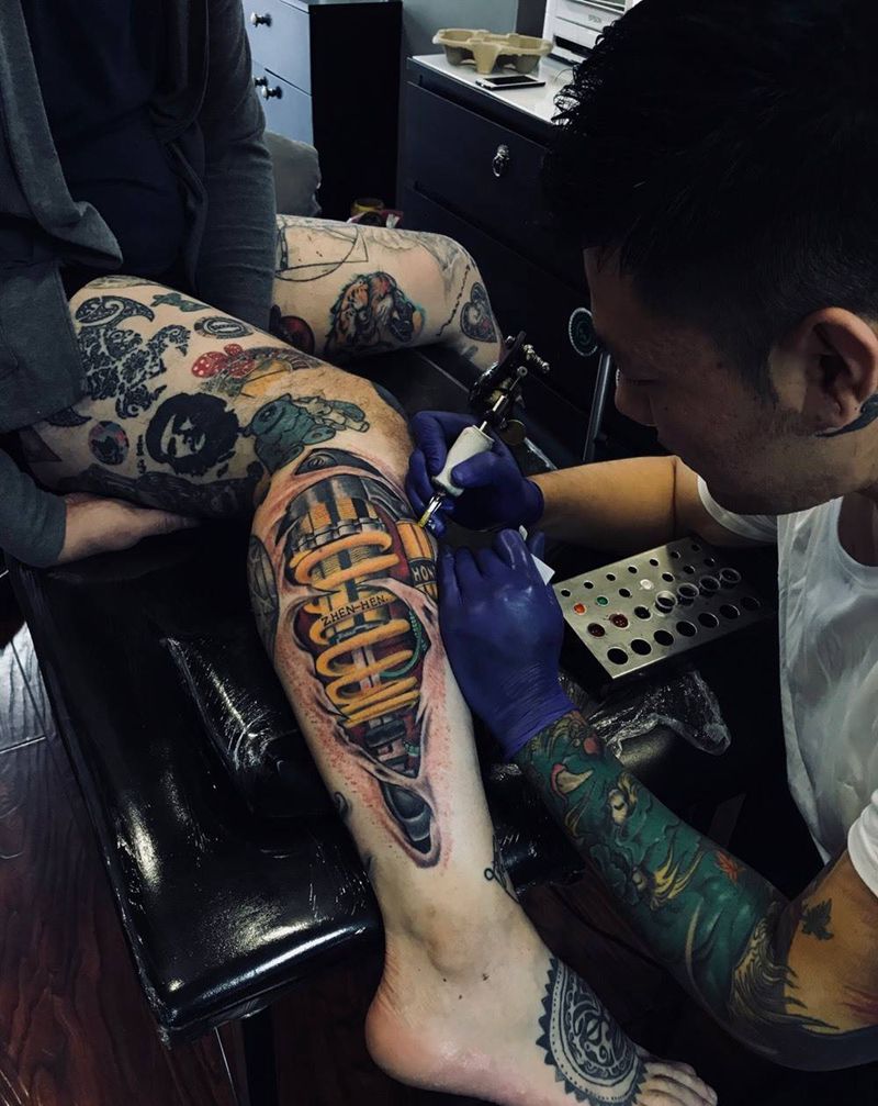 当前位置: 首页 >辽宁省大连市纹身店-大连针痕刺青纹身图案>机械纹身纹身图片_腿部欧美写实减震器机械纹身图案