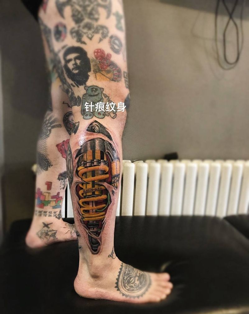 当前位置: 首页 >辽宁省大连市纹身店-大连针痕刺青纹身图案>机械纹身纹身图片_腿部欧美写实减震器机械纹身图案