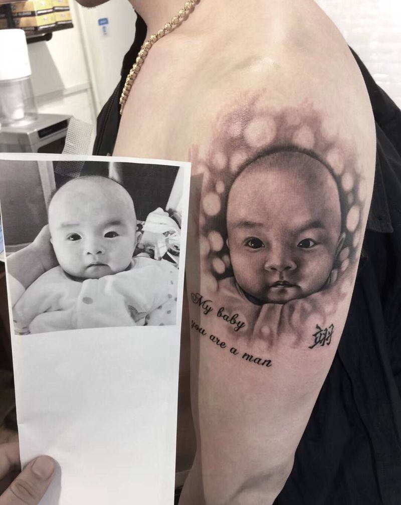 本店肖像作品纹身图片_肩部手臂欧美写实纹身图案