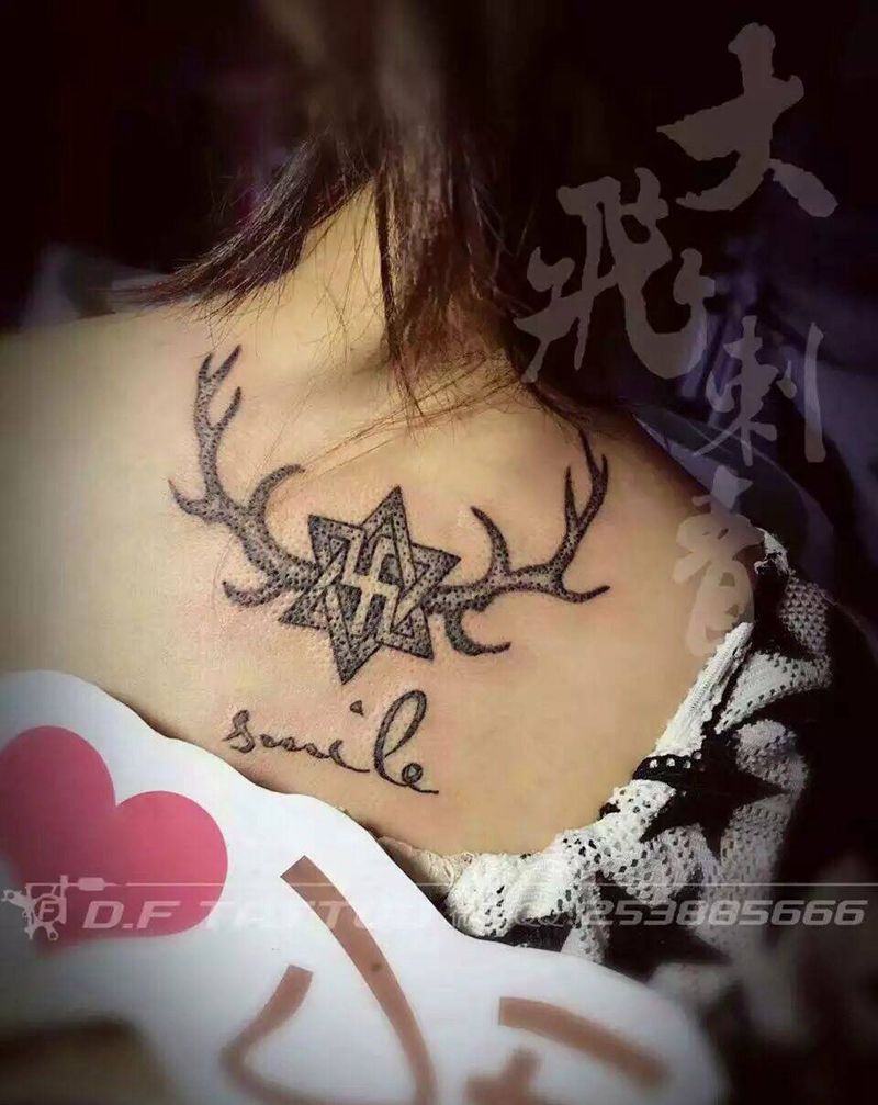 小清新纹身图片_女生英文清新鹿手臂颈部腿部毛笔字纹身图案