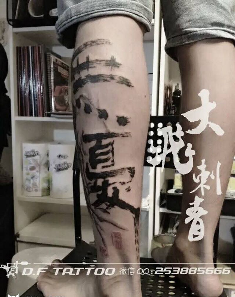 无忧纹身图片_腿部写实人物水墨毛笔字纹身图案
