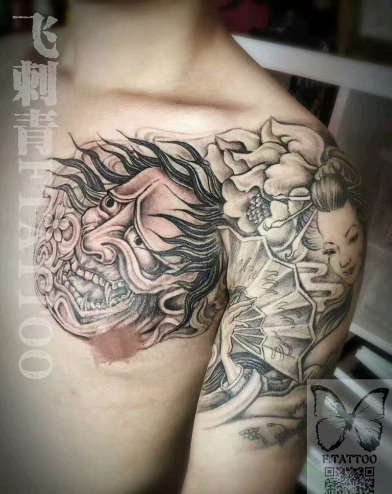 当前位置: 首页 >辽宁省大连市纹身店-飞·刺青工作室纹身图案>般若+艺妓 半甲纹身图片_胸部手臂传统人物艺妓般若半甲成品纹身图案