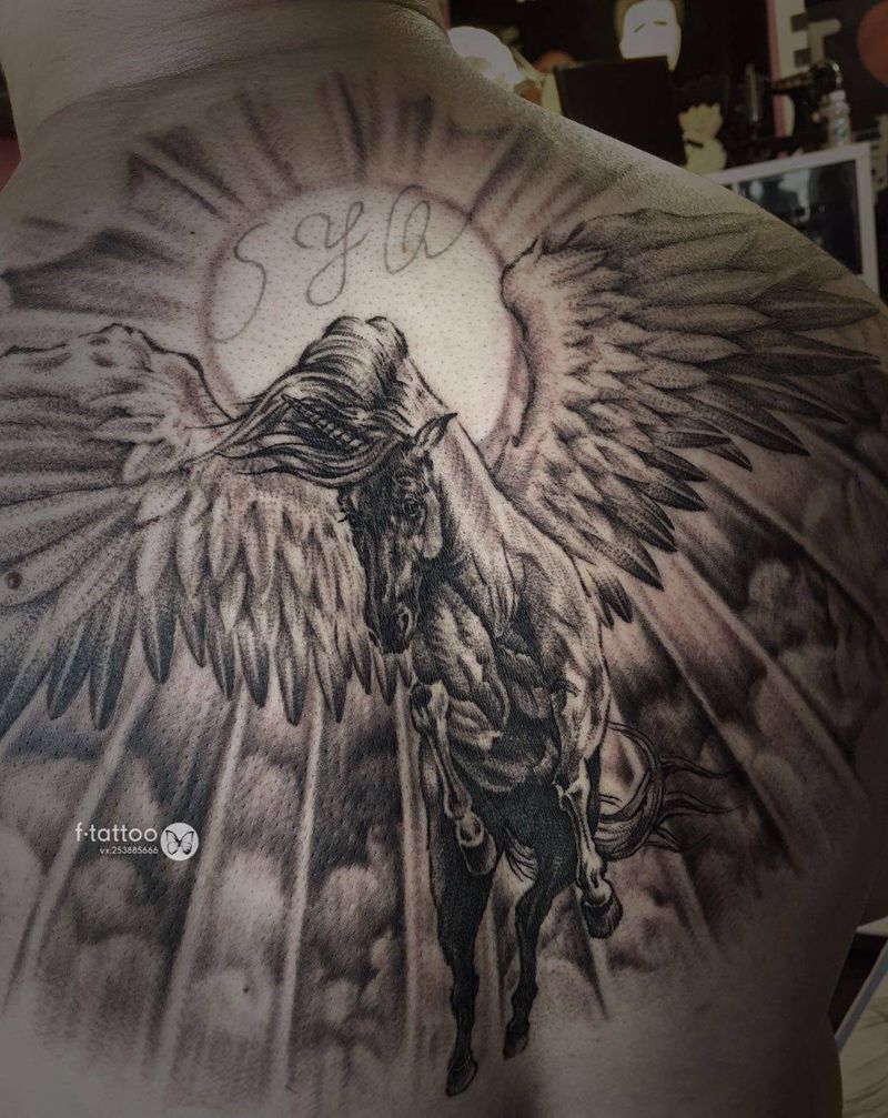独角兽纹身图片_背部欧美写实新传统独角兽黑灰纹身图案