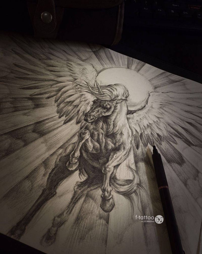 独角兽纹身图片_背部欧美写实新传统独角兽黑灰纹身图案