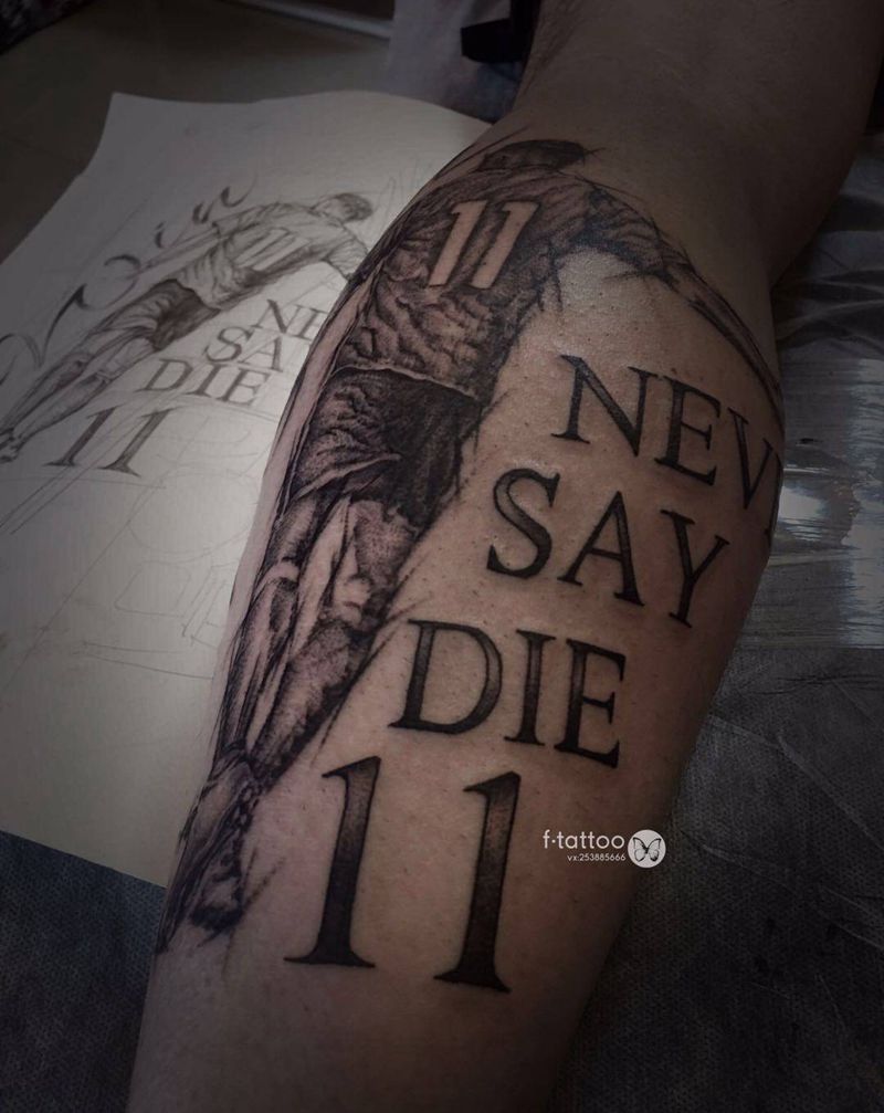 当前位置: 首页 >辽宁省大连市纹身店-飞·刺青工作室纹身图案>留念.纹身图片_成品腿部欧美肖像人物英文字母足球纹身图案