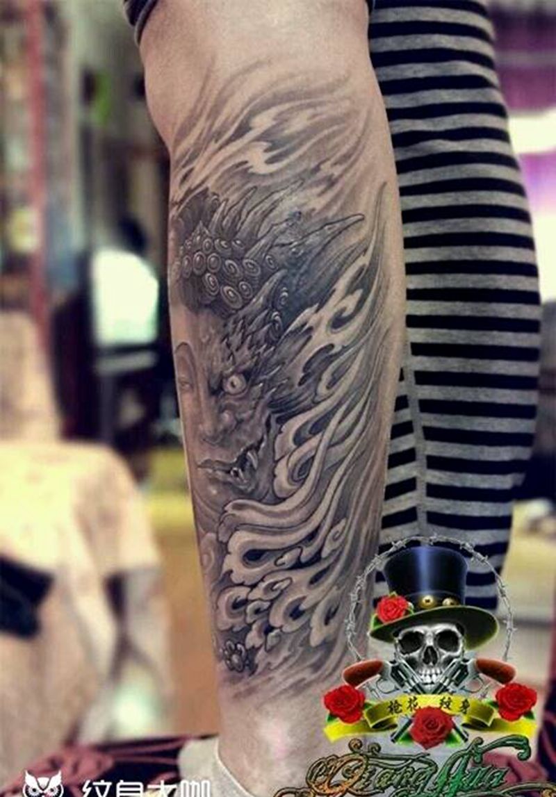 当前位置: 首页 >辽宁省抚顺市纹身店-枪花纹身机构纹身图案>佛魔纹身图片_腿部传统人物鬼神宗教成品纹身图案