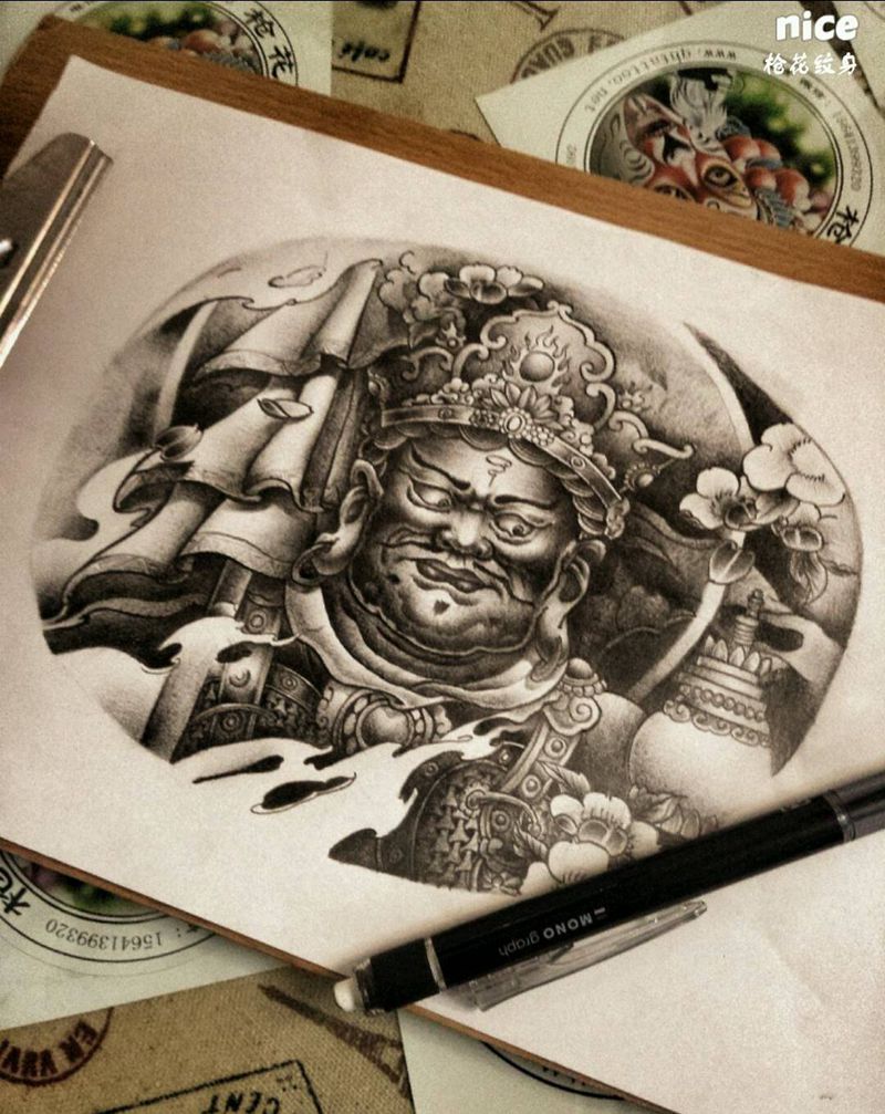 多闻天王纹身图片_传统肖像人物鬼神宗教成品手稿纹身图案
