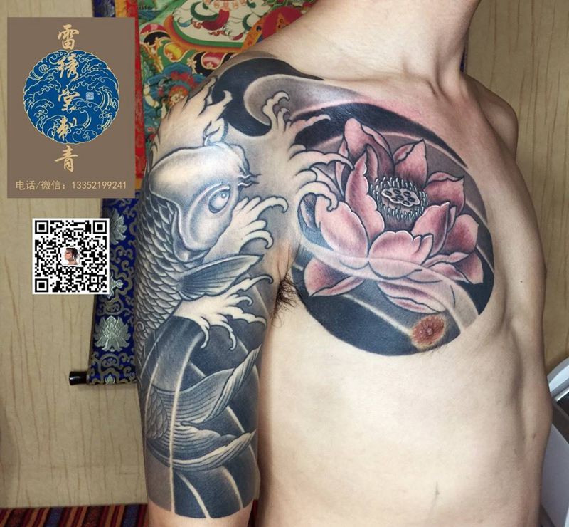当前位置: 首页 >辽宁省锦州市纹身店-雷绣堂刺青纹身图案>半甲鲤鱼荷花纹身图片