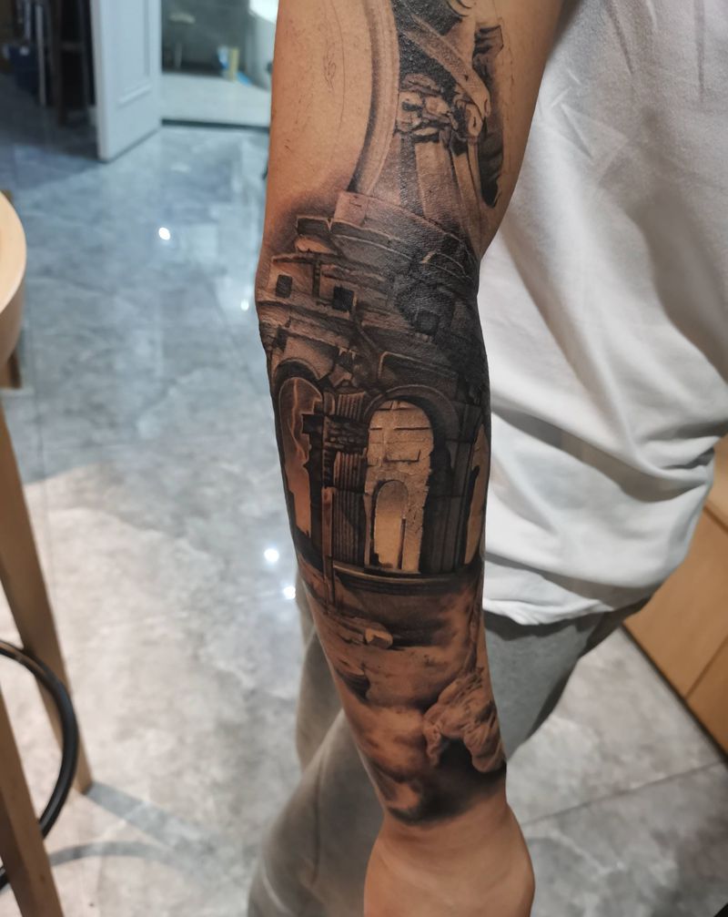 破财的神殿纹身图片_手臂欧美写实纹身图案