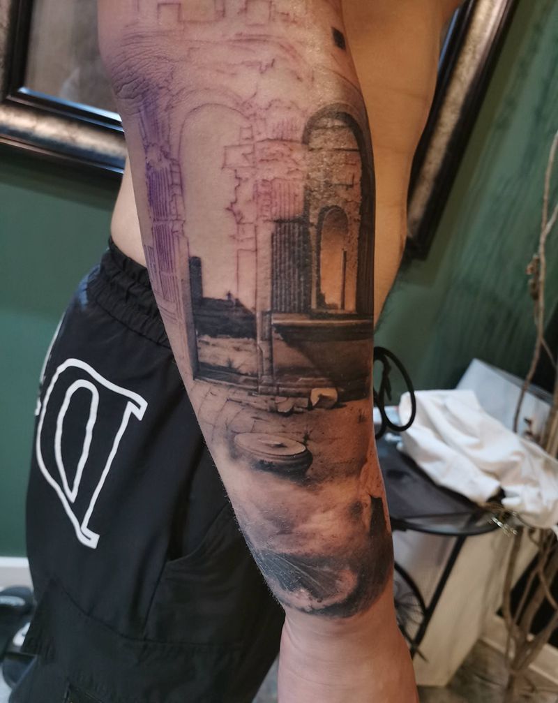 破财的神殿纹身图片_手臂欧美写实纹身图案
