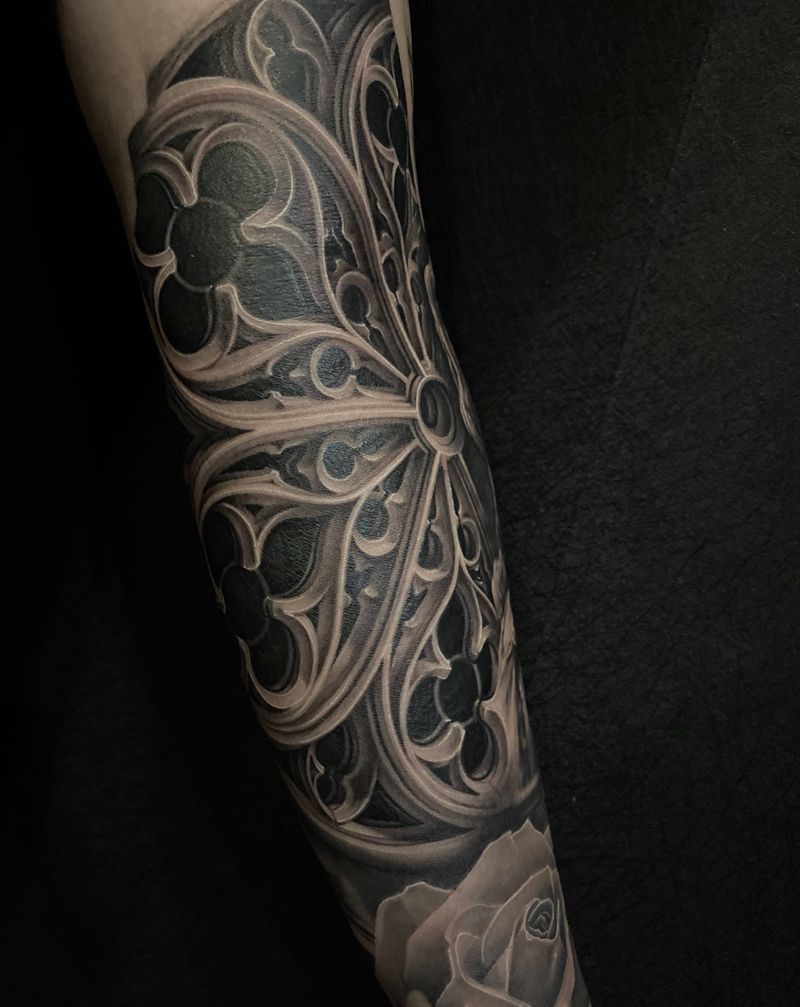 当前位置: 首页 >辽宁省抚顺市纹身店-氢刺TATTOO 纹身图案>窗花纹身图片_手臂欧美写实纹身图案