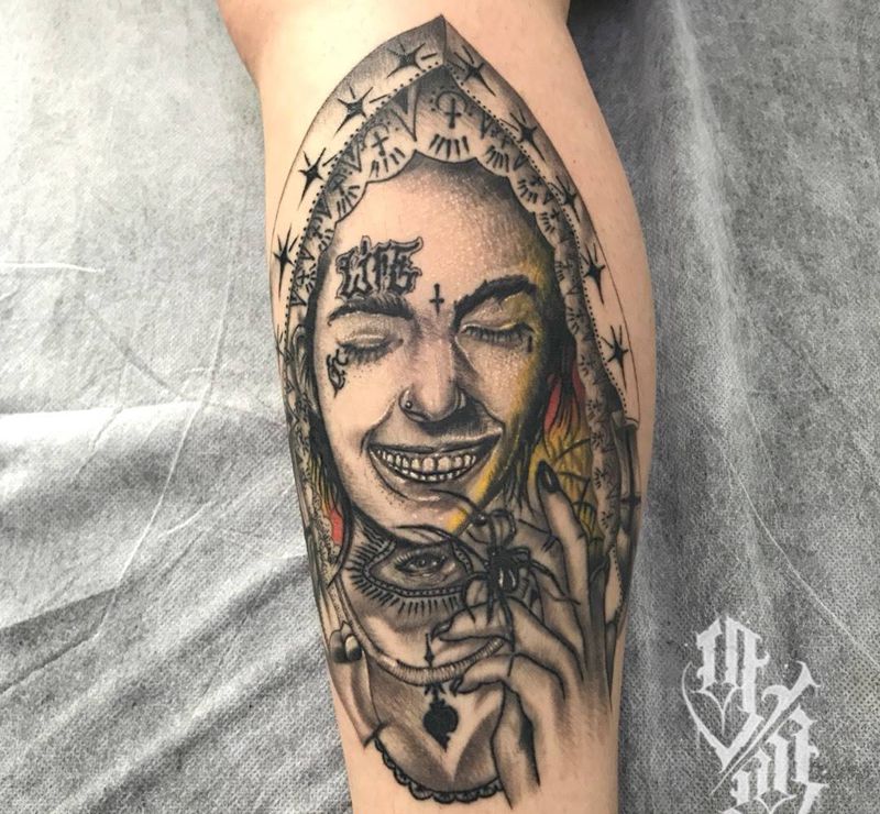 • T包小腿吹火男+阿多福纹身图片_腿部老传统新传统吹火男阿