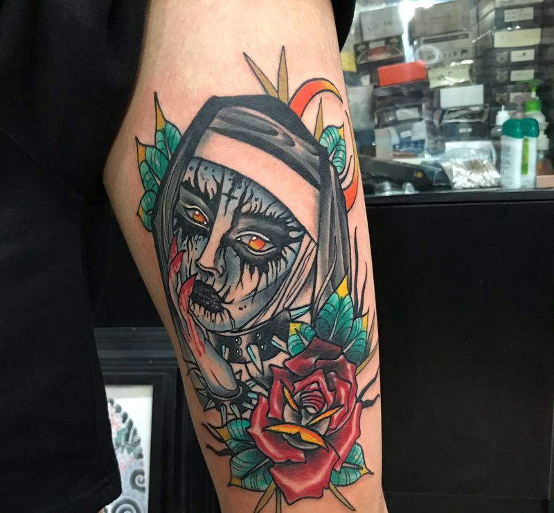 修女 遮盖工作纹身图片_腿部New School纹身图案