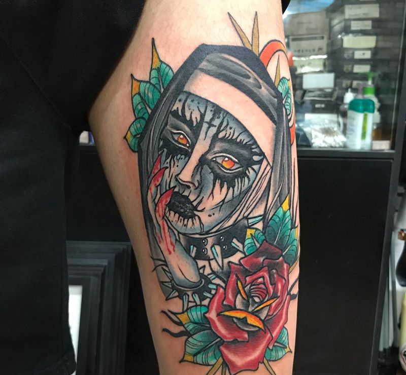 修女 遮盖工作纹身图片_腿部New School纹身图案