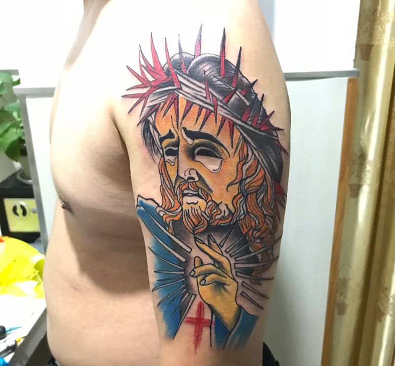 耶稣纹身图片_手臂New School纹身图案