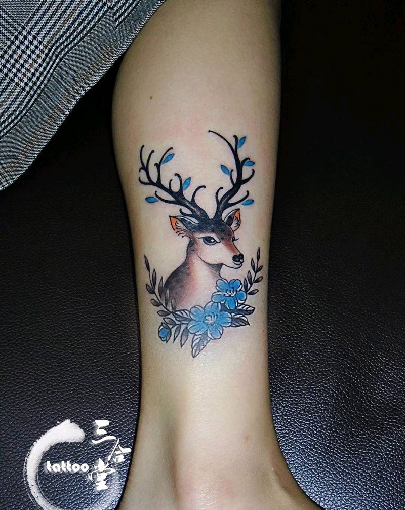 当前位置: 首页 >辽宁省营口市纹身店-三合堂纹身纹身图案>鹿纹身图片_腿部水彩水墨鹿小清新脚踝纹身图案