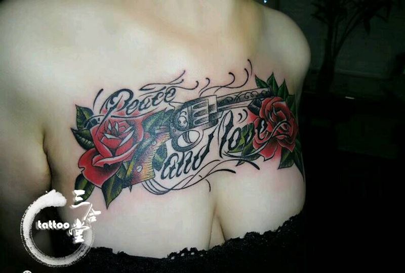枪炮玫瑰纹身图片_胸部欧美植物营口鲅鱼圈纹成品纹身图案