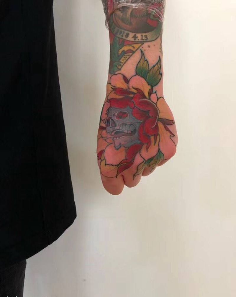 当前位置: 首页 >辽宁省盘锦市纹身店-沧水刺青纹身图案>牡丹/骷髅纹身图片_手部New School纹身图案