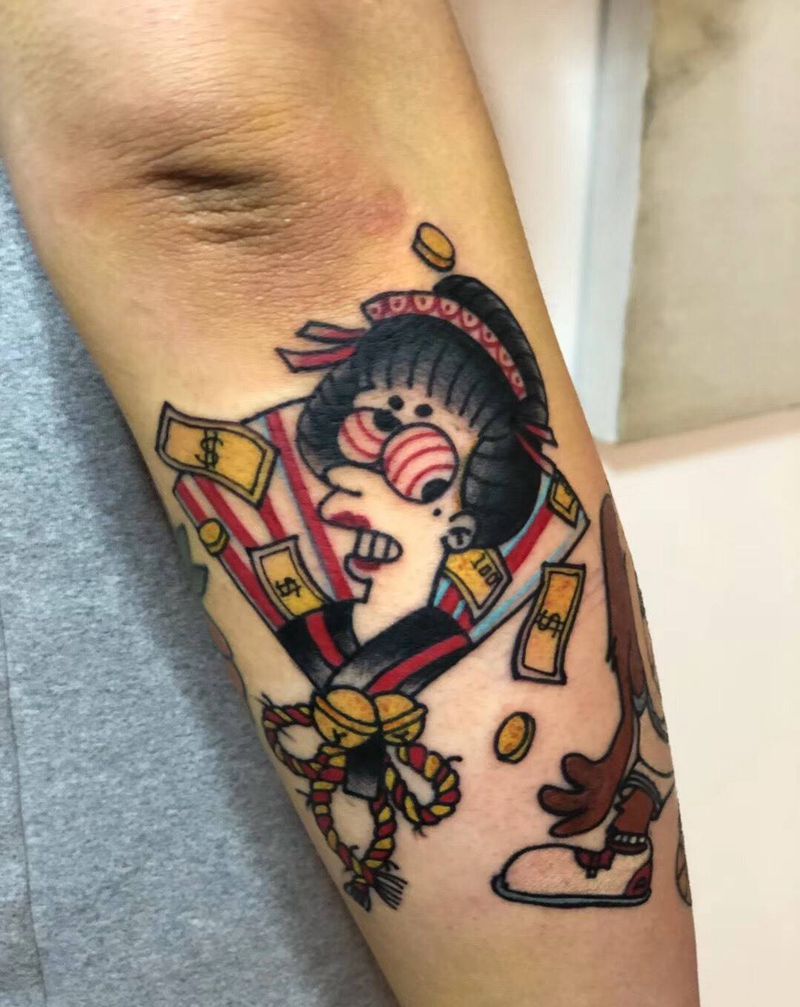 • T包小腿吹火男+阿多福纹身图片_腿部老传统新传统吹火男阿