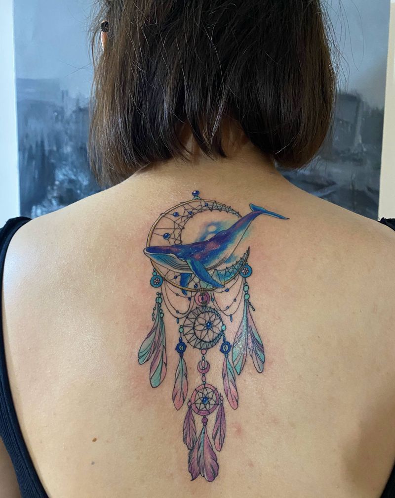 当前位置: 首页 >辽宁省盘锦市纹身店-沧水刺青纹身图案>捕梦网纹身图片_背部几何水彩纹身图案